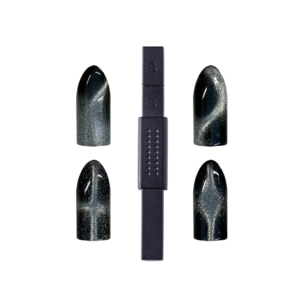 Apply Cat Eye Gel Polish and use magnet. When you are happy with the magnetic pattern, cure it in the UV/LED lamp and overlay with Top Gel.