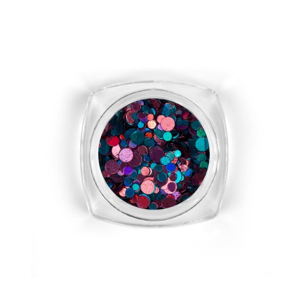 Holo metallic confetti glitter. Mixture of size and color. When used on top of a nail, top with Perfect Top Gel.